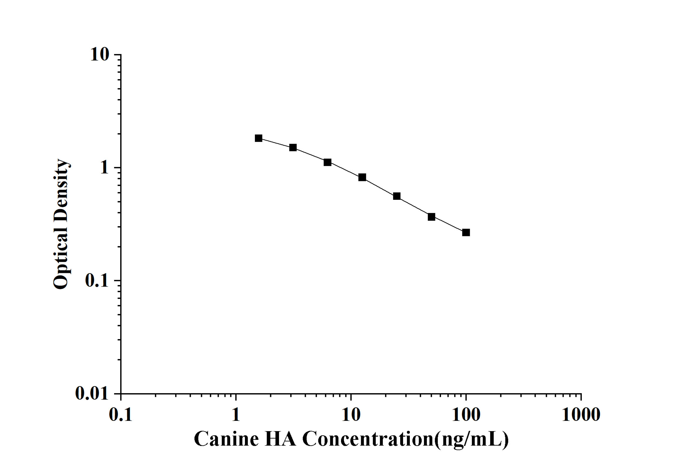 As the OD values of the standard curve may vary according to the conditions of the actual assay performance (e.g. operator, pipetting technique, washing technique or temperature effects), the operator should establish a standard curve for each test. Typical standard curve and data is provided below for reference only.