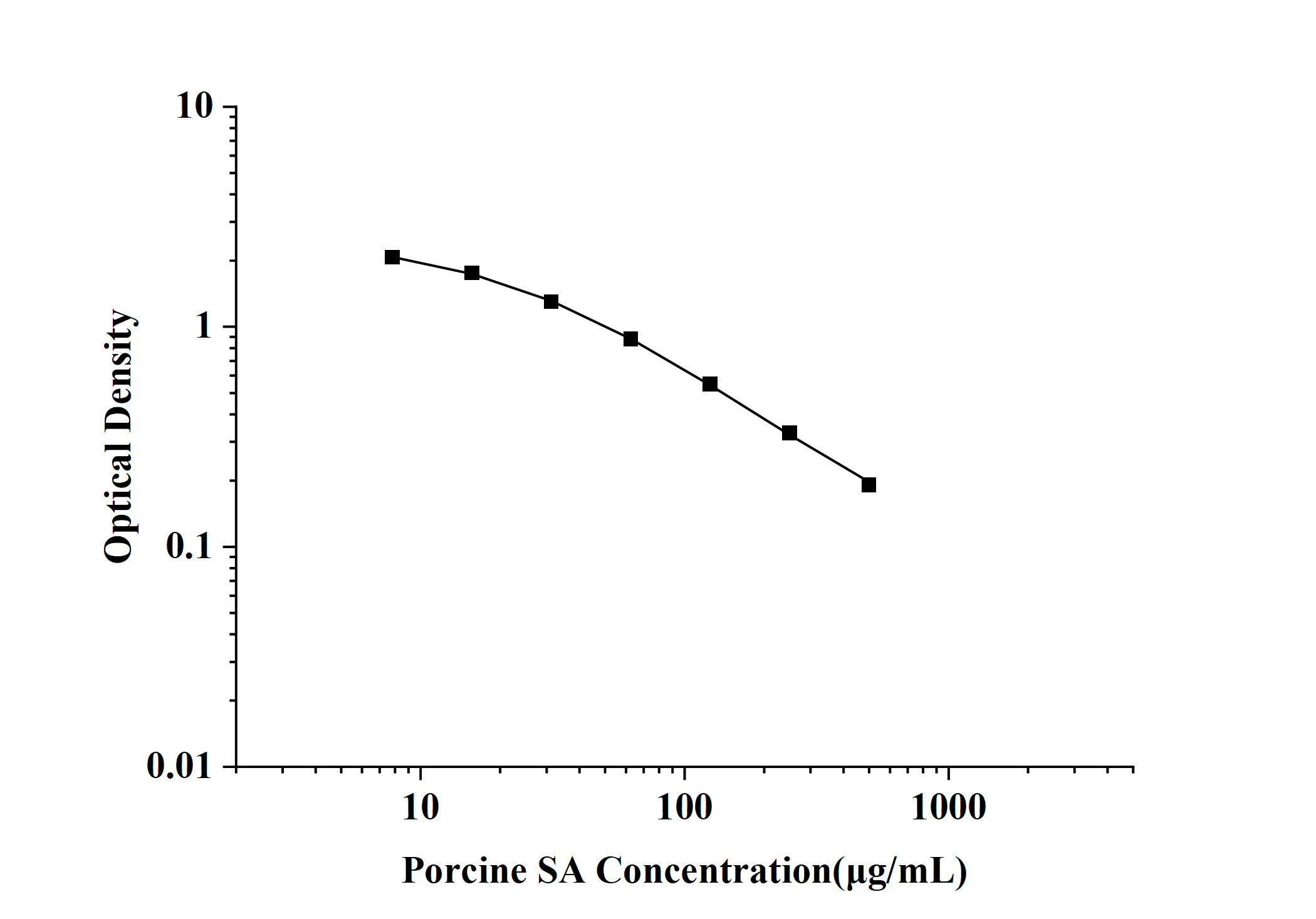 | Test principle | This ELISA kit uses the Competitive-ELISA principle. The micro ELISA plate provided in this kit has been pre-coated with Porcine SA. Standards or samples are added to the appropriate micro ELISA plate wells then with a biotin-conjugated antibody specific to Porcine SA. Next,Avidin conjugated to Horseradish Peroxidase (HRP) is added to each microplate well and incubated. After TMB substrate solution is added. The enzyme-substrate reaction is terminated by the addition of sulphuric acid solution and the color change is measured spectrophotometrically at a wavelength of 450nm ± 10nm. The concentration of Porcine SA in the samples is then determined by comparing the OD of the samples to the standard curve. | ||
