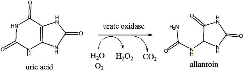 The uric acid metabolized into the allantoin under the Uricase catalyzes. Then it is easily soluble in water and can be directly excreted from the body, or it can also be further metabolized into urea or ammonia and excreted from the body [1].