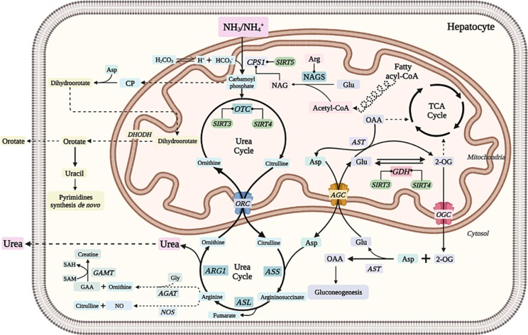 Ammonia (upper left) undergoes a complex metabolic cycle to become urea (lower left). Urea dissolves in water and can be excreted from the body through the urinary system.