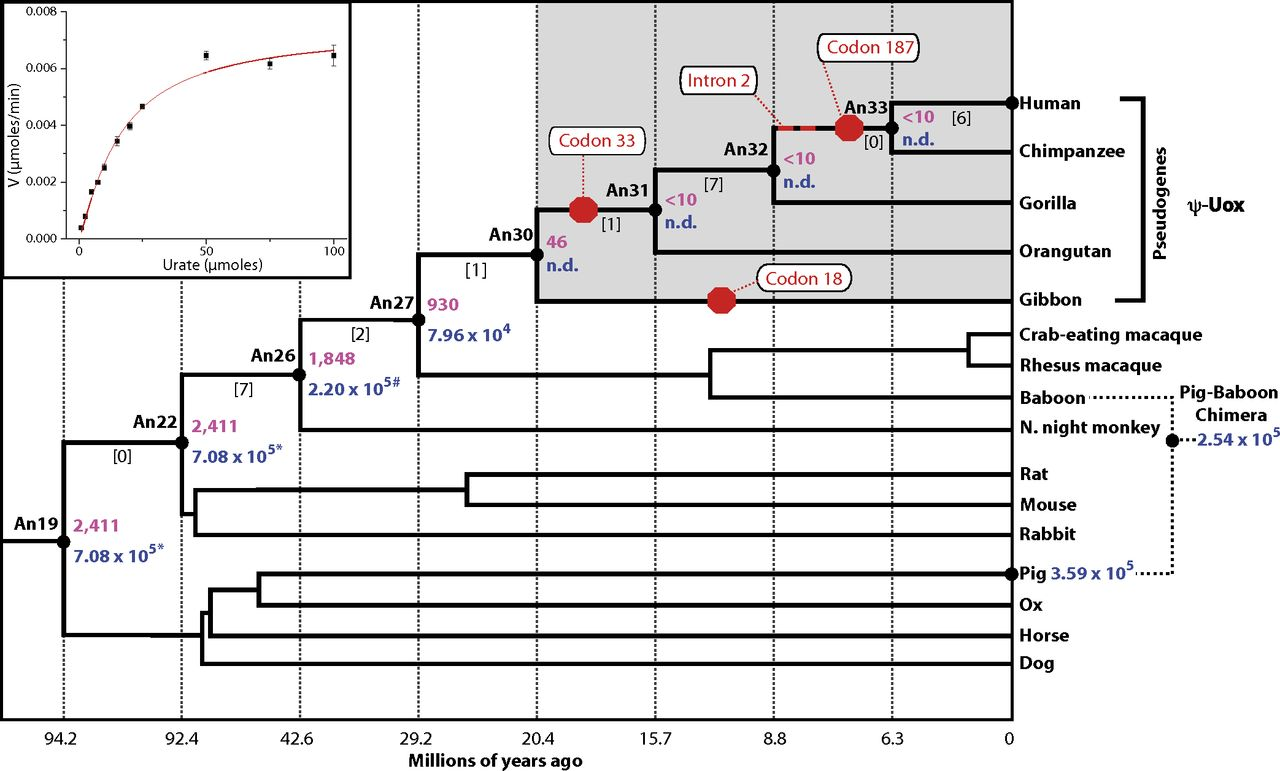 Our ancestors' uricase gene underwent multiple point mutations (three have been identified) and the insertion/deletion, turning it into a pseudogene and losing the encoding function [5] [6].
