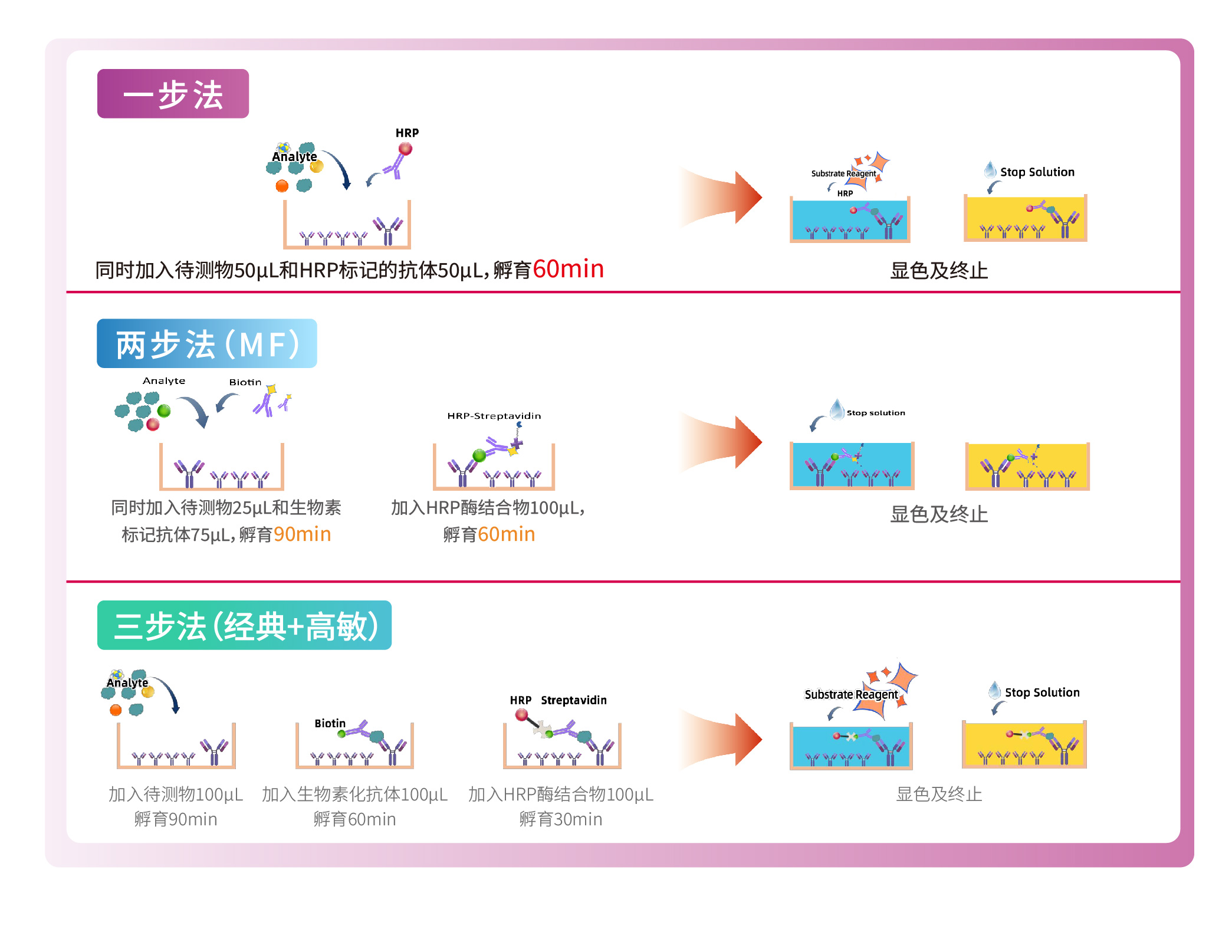 The innovative one-step detection technology of Reed Biotech® ELISA Kits simplifies incubation to just one step, cutting total test time down to 1.5 hours.
