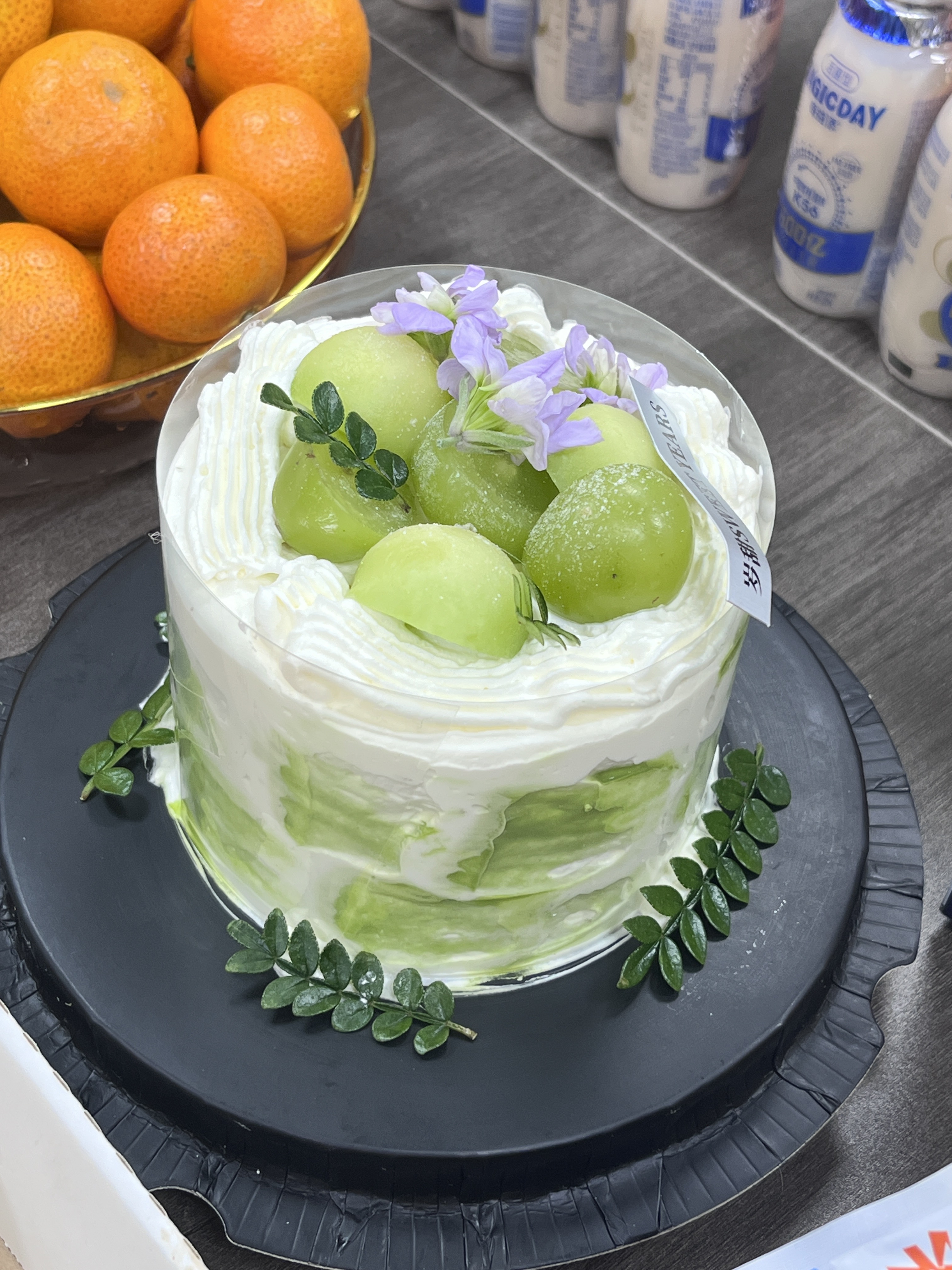 masks couldn't hide their smiles, and the green gift boxes of souvenirs made the atmosphere more vivid. Even the air was filled with the sweet fragrance of the cake. The cream cake covered with green grapes was sweet to the heart just looking at it~