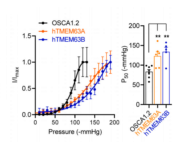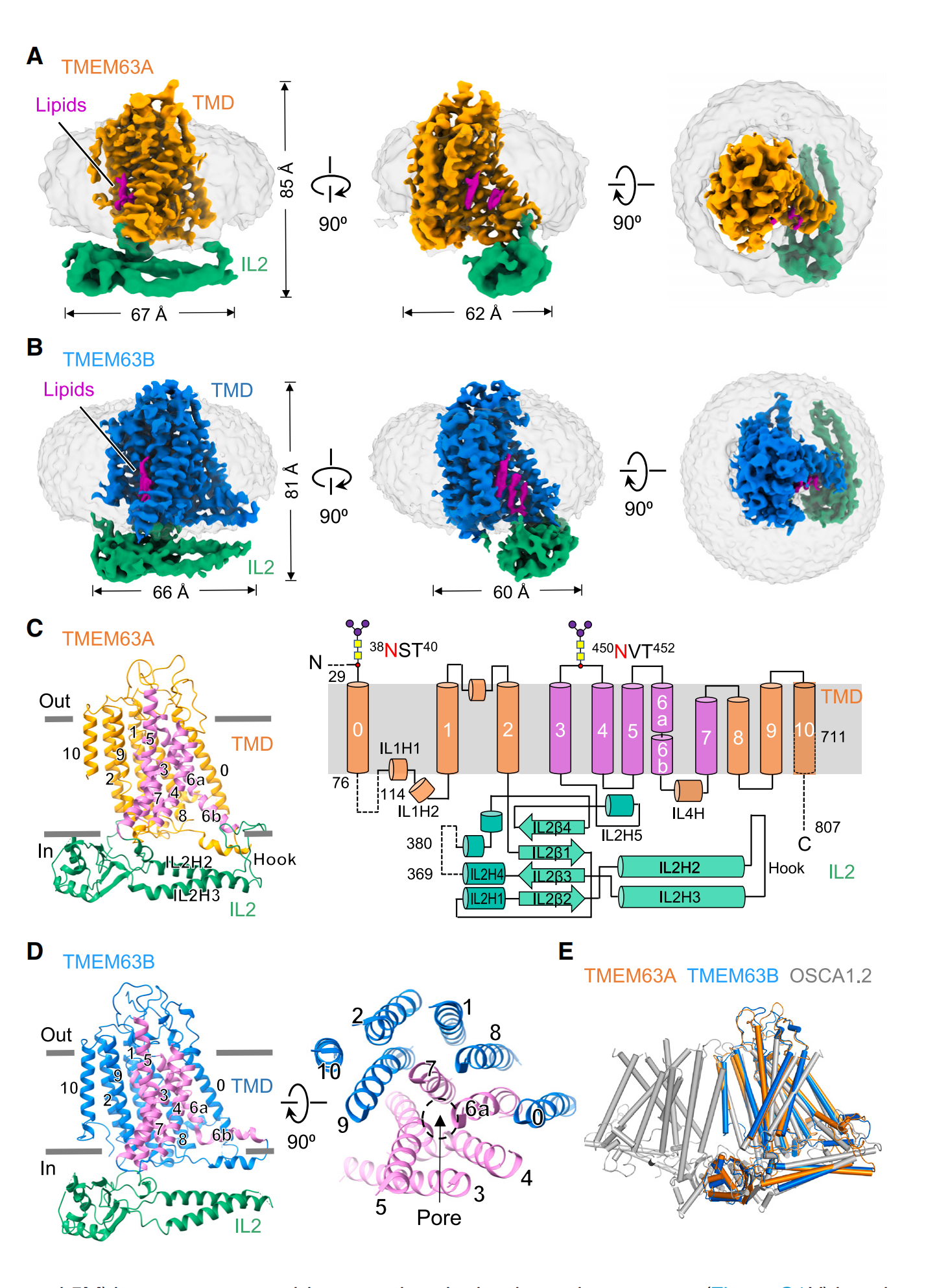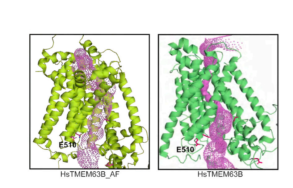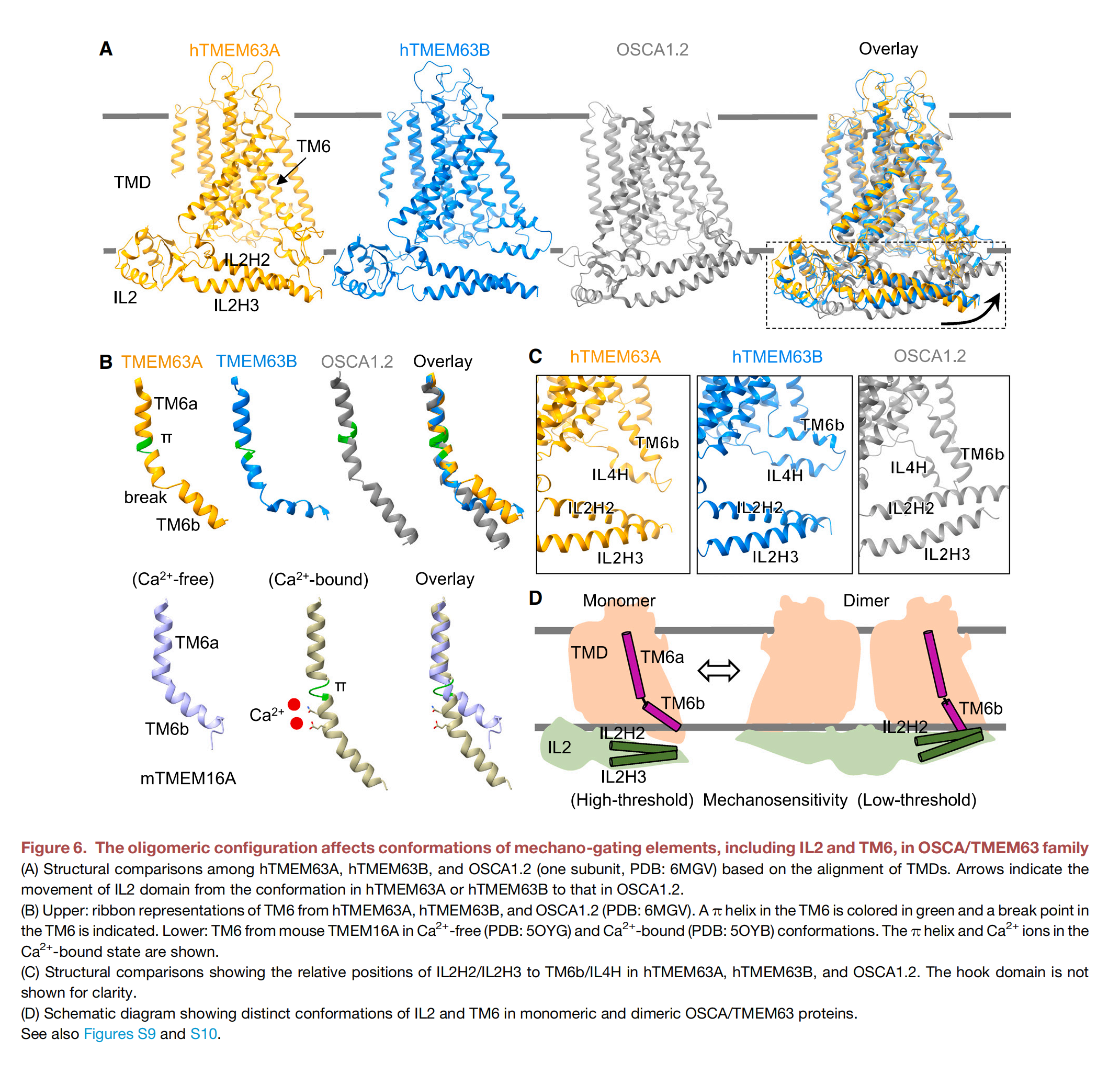 As a monomer, TMEM63B has 11 transmembrane helices that form the actual ion pore, an N-terminal domain folded into a hairpin on the outside of the channel, and a structure called IL2 that runs parallel to the inside of the channel. One end of IL2 forms a hook that extends into the membrane—suggesting it can sense membrane tension. Although not yet confirmed, the cavity formed by the transmembrane portion of TMEM63B may be used to deposit lipids. Lipids are crucial for regulating mechanosensitive ion channels, so this makes sense. Interestingly, the plant version of TMEM63, OSCA, functions as a dimer, even though each monomer forms a pore. Scientists propose that IL2 may be involved in forming monomers or dimers, especially since switching from one form to the other appears to affect mechanosensitivity—not by influencing pore conductivity, but by altering how long the pore remains open.