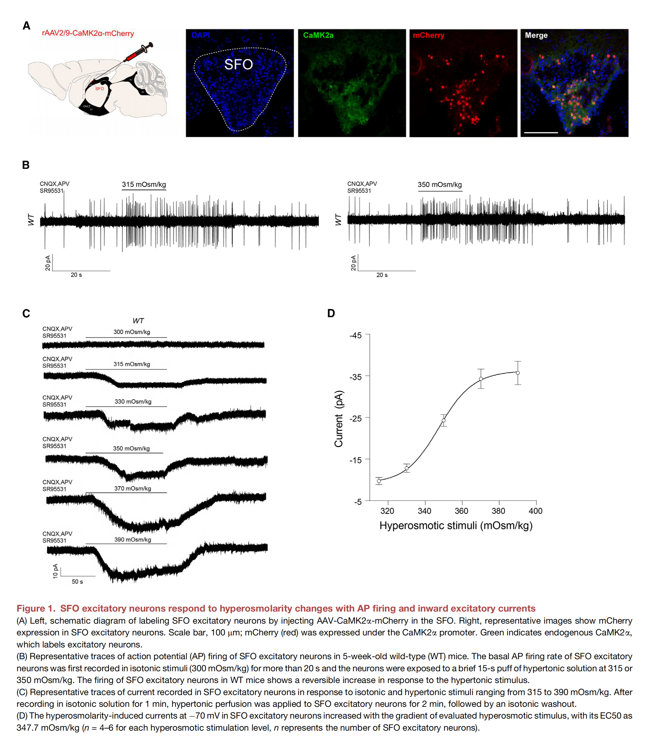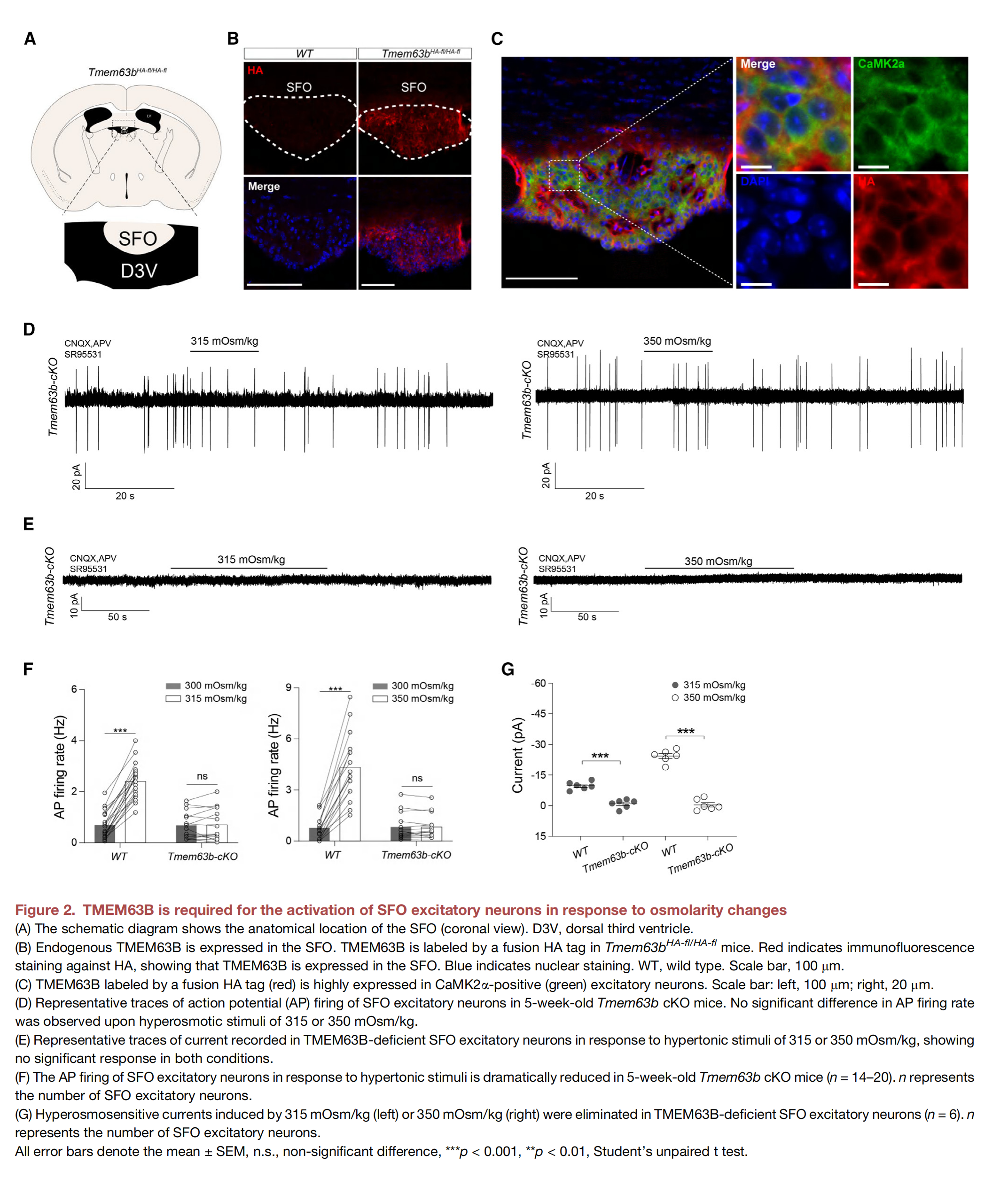 Mechanical sensors exist across all domains of life, in various tissues, and respond to a range of mechanical forces. The proteins present in the SFO were only identified recently, even though they belong to the largest family of mechanical sensors: transmembrane protein 63, or TMEM63 for short. The mechanosensitive ion channels of the TMEM63 family are conserved from plants (where they are called OSCAs) to animals and consist of three members: TMEM63A, B, and C. TMEM63B is highly expressed in SFO neurons and senses blood hyperosmolality. In other words, TMEM63B measures the phenomenon where the concentration of particles like salt or glucose is abnormally high due to water deficiency. This is converted into a chemical signal that is transmitted to the brain and translated into “thirst”.