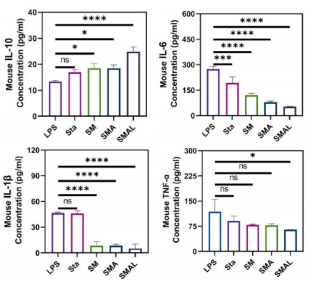 Laboratory verification showed that the bacteriostatic rate against methicillin-resistant Staphylococcus aureus (MRSA) exceeded 99%, and scanning electron microscopy revealed bacterial cell membrane rupture and content leakage. More impressively, it can effectively destroy bacterial biofilms—the culprit behind 90% of chronic infections. In a high oxidative stress environment simulated by H₂O₂, the intracellular ROS level in the SMAL group decreased by nearly 70%, and mitochondrial function returned to normal. DPPH free radical scavenging experiments showed that its antioxidant capacity increased in a dose-dependent manner. Meanwhile, macrophages "turned over a new leaf": ELISA tests showed that pro-inflammatory factors TNF-α, IL-1β, and IL-6 decreased significantly, anti-inflammatory factor IL-10 increased significantly, and macrophages polarized from M1 to M2 type. In a high-lipid environment, the ALP activity in the SMAL group increased by 3 times, with dense mineralized nodules (Alizarin Red staining), while the control group showed numerous lipid droplets in Oil Red O staining.
