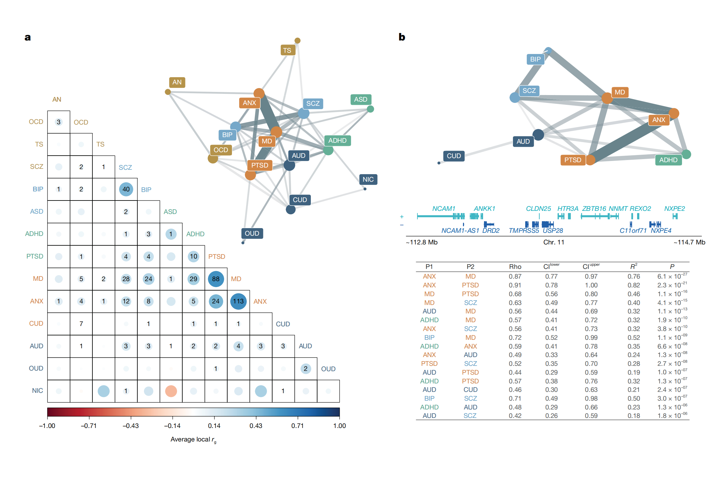 Figure 2: Local genetic correlations between the chromosome 11 hotspot region (NCAM1-TTC12-ANKK1-DRD2) and 8 disorders.