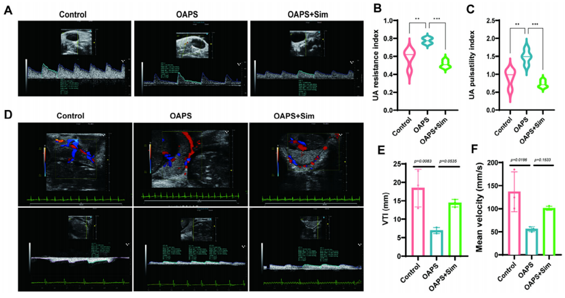 Ultrasound examination confirmed that simvastatin reduced the pulsatility index (PI) and resistance index (RI) of the uterine artery in OAPS mice, lowering vascular resistance. It also restored endothelial nitric oxide synthase (eNOS) expression, improving vasodilation and ensuring adequate blood supply to the placenta.