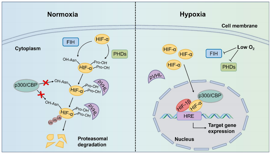 Under normoxia (sufficient oxygen), HIF-α is hydroxylated by PHD enzymes, ubiquitinated and labeled by VHL, and rapidly degraded by the proteasome; FIH further blocks coactivator binding, resulting in complete silencing of the pathway. In a hypoxic environment, the activity of PHD/FIH is inhibited, preventing HIF-1α degradation and leading to its cytoplasmic accumulation. The PAS domain of accumulated HIF-α then binds to the β subunit to form a heterodimer, which attaches to hypoxia response elements (HRE) and recruits coactivators such as p300/CBP to the promoter regions of target genes, thereby regulating gene transcription. This is the fundamental reason for the persistent activation of HIF in hypoxic tumors.