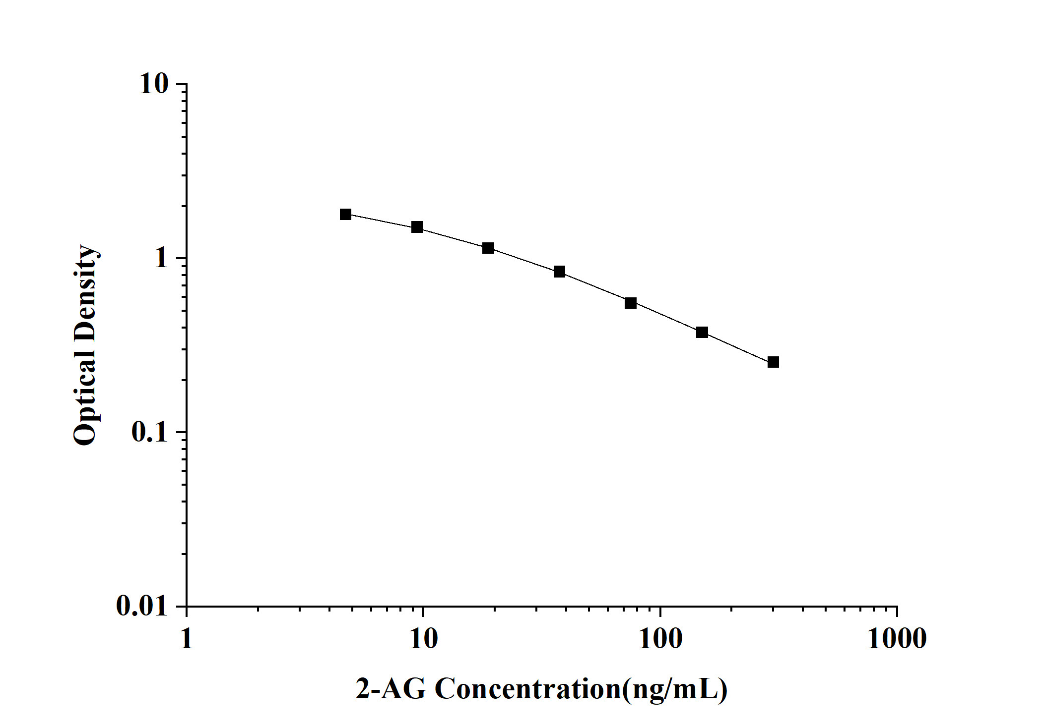 As the OD values of the standard curve may vary according to the conditions of the actual assay performance (e.g. operator, pipetting technique, washing technique or temperature effects), the operator should establish a standard curve for each test. Typical standard curve and data is provided below for reference only.