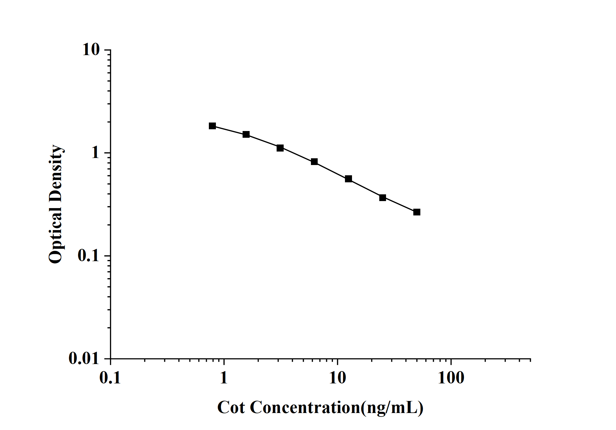 As the OD values of the standard curve may vary according to the conditions of the actual assay performance (e.g. operator, pipetting technique, washing technique or temperature effects), the operator should establish a standard curve for each test. Typical standard curve and data is provided below for reference only.