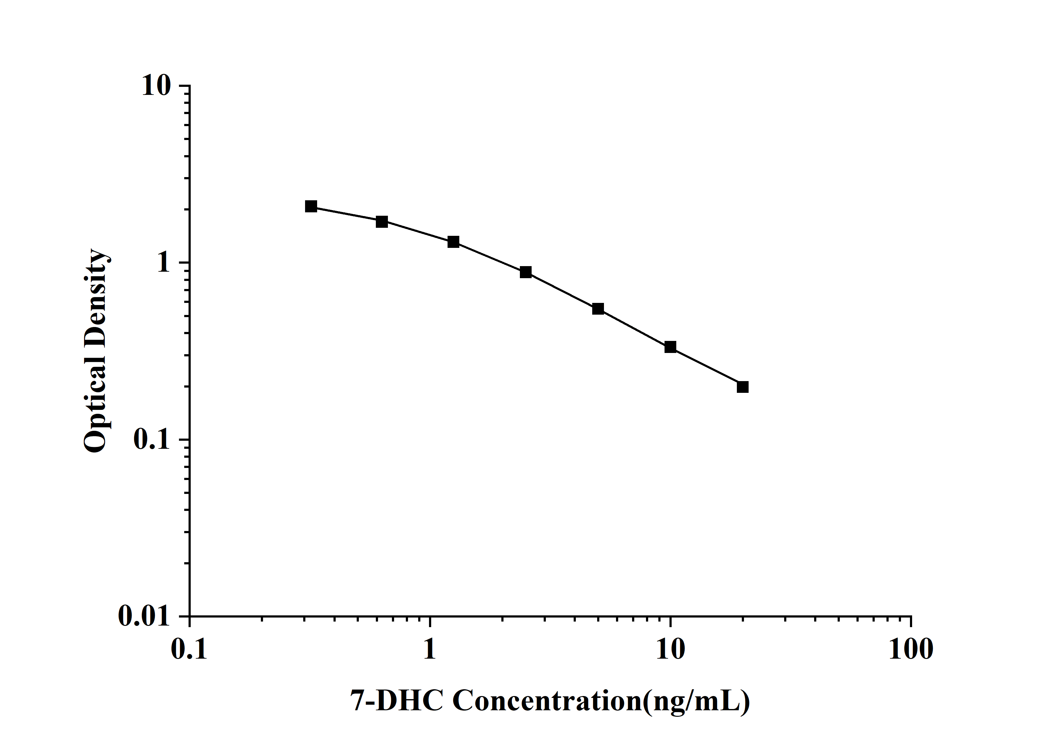 As the OD values of the standard curve may vary according to the conditions of the actual assay performance (e.g. operator, pipetting technique, washing technique or temperature effects), the operator should establish a standard curve for each test. Typical standard curve and data is provided below for reference only.