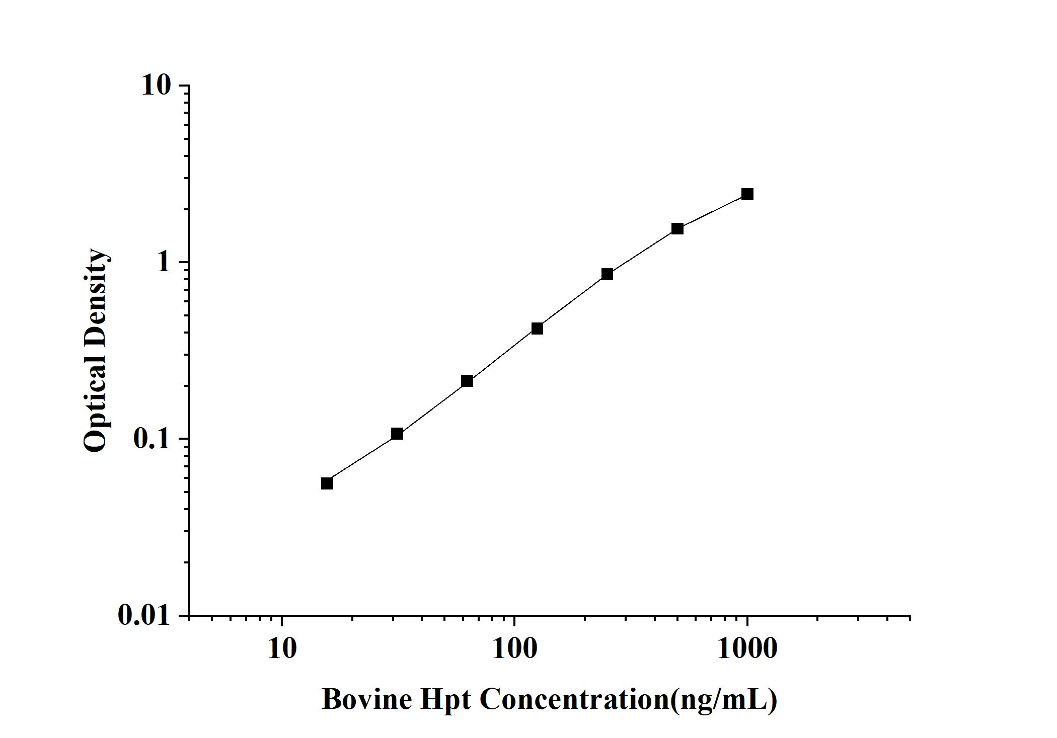 As the OD values of the standard curve may vary according to the conditions of the actual assay performance (e.g. operator, pipetting technique, washing technique or temperature effects), the operator should establish a standard curve for each test. Typical standard curve and data is provided below for reference only.