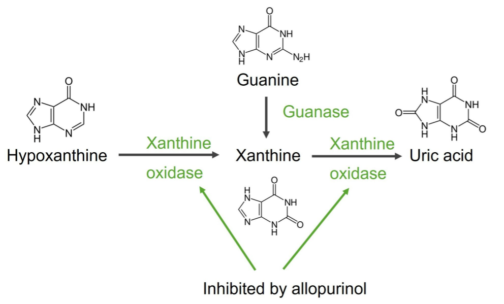 The uric acid metabolized into the allantoin under the Uricase catalyzes. Then it is easily soluble in water and can be directly excreted from the body, or it can also be further metabolized into urea or ammonia and excreted from the body [1].