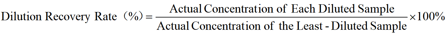 The dilution recovery rate is calculated as the ratio of the measured concentration of the diluted sample to that of the undiluted sample (dilution factor = 1).