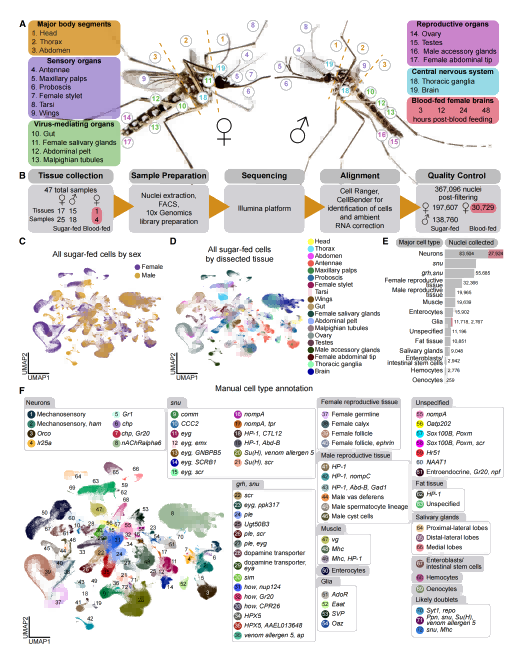 On October 30, 2025, the international top journal Cell published online the latest research results from institutions including Rockefeller University: the first single-nucleus transcriptomic atlas of adult Aedes aegypti. This study, for the first time at single-cell resolution, comprehensively analyzed the cellular composition and gene expression differences between male and female mosquitoes, providing an unprecedented perspective for understanding mosquito behavior, sexual dimorphism, and disease transmission mechanisms.