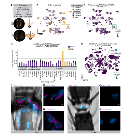 The research team found a special type of cell expressing the ppk317 gene in the antennae of male mosquitoes, which is completely absent in female mosquitoes. ppk317 belongs to the "pickpocket" ion channel family and may be involved in mechanical or chemical sensing. RNA in situ hybridization experiments further confirmed that these cells are distributed at the antennal joints of male mosquitoes, suggesting their potential role in gender-specific sensory functions.