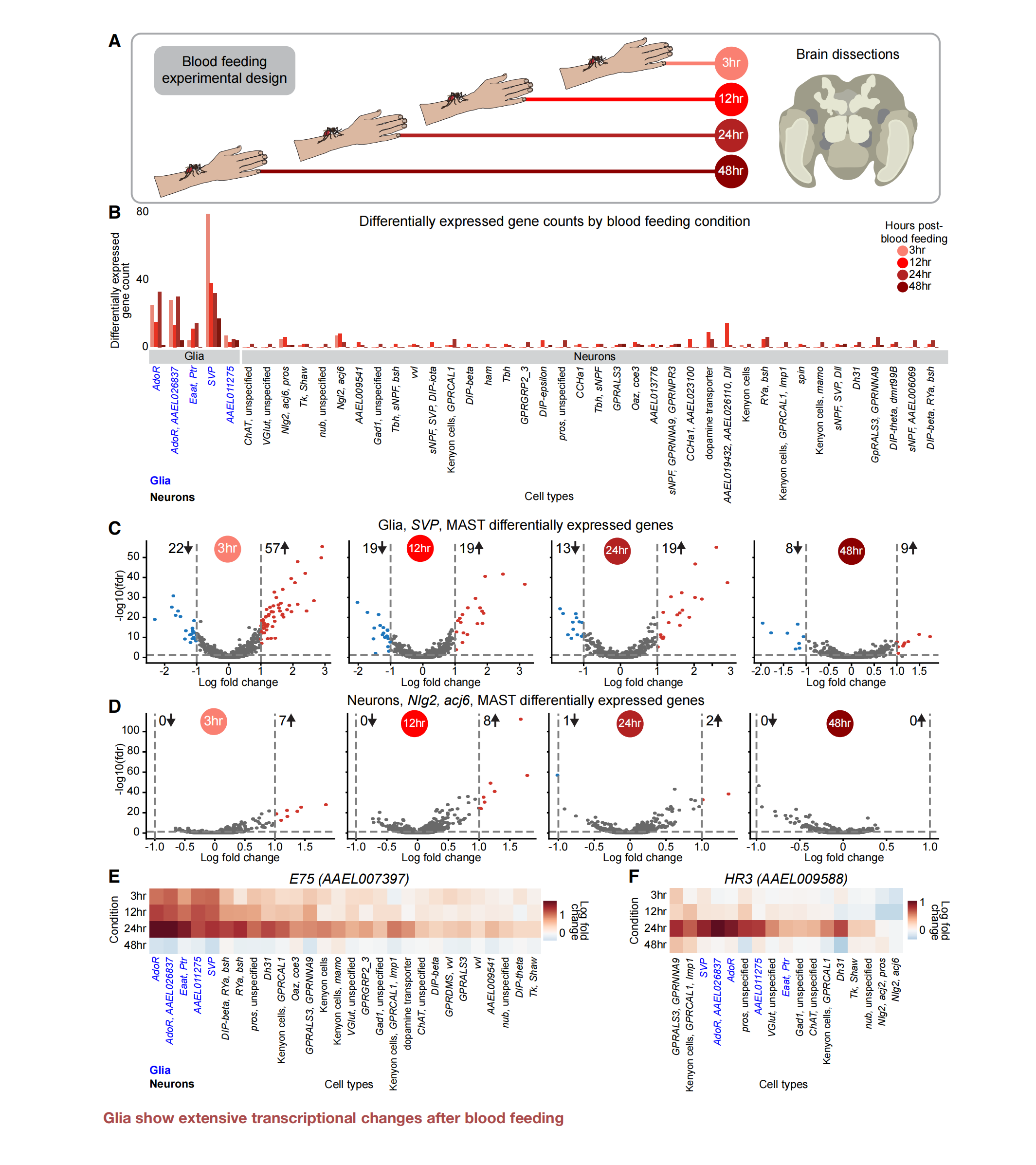 •For the first time, found that glial cells in the female mosquito brain undergo drastic transcriptional changes after blood-feeding, rather than neurons.
