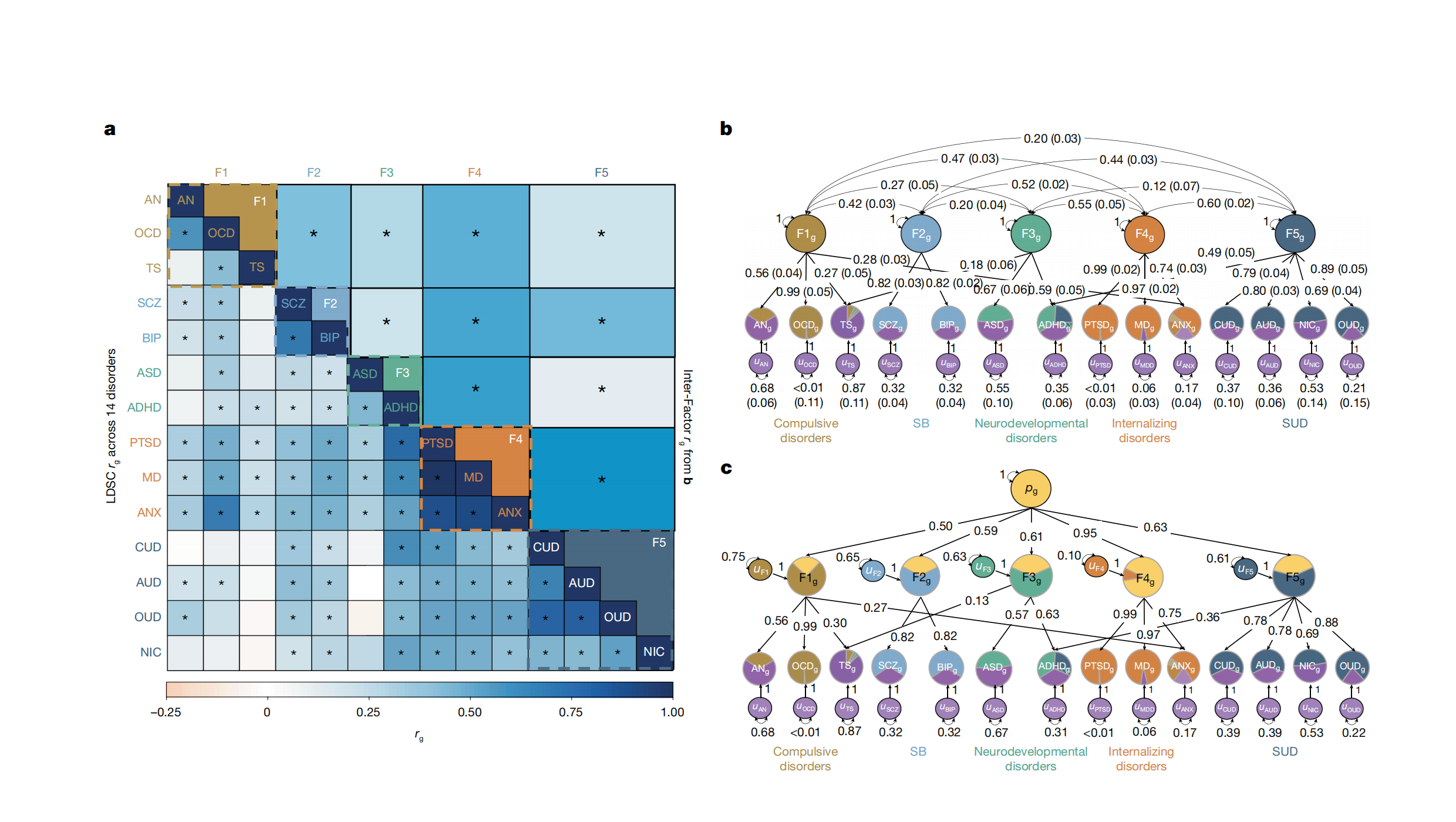 Figure 1: Five-factor model (Genomic Structural Equation Modeling) and heatmap of genetic correlations with external traits