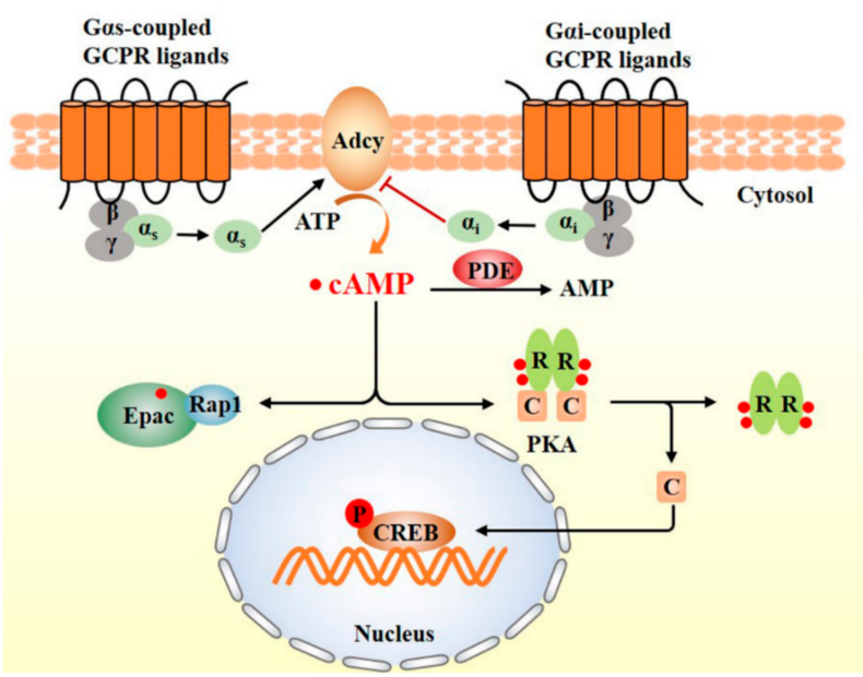 cAMP is generated from adenosine triphosphate (ATP) under the catalysis of adenylyl cyclase (AC). This reaction consumes ATP and removes two phosphate groups, forming the unique cyclic structure of cAMP. Mammals possess 10 AC isoforms: 9 transmembrane ACs (tmAC1–9) and 1 soluble AC (sAC or AC10)