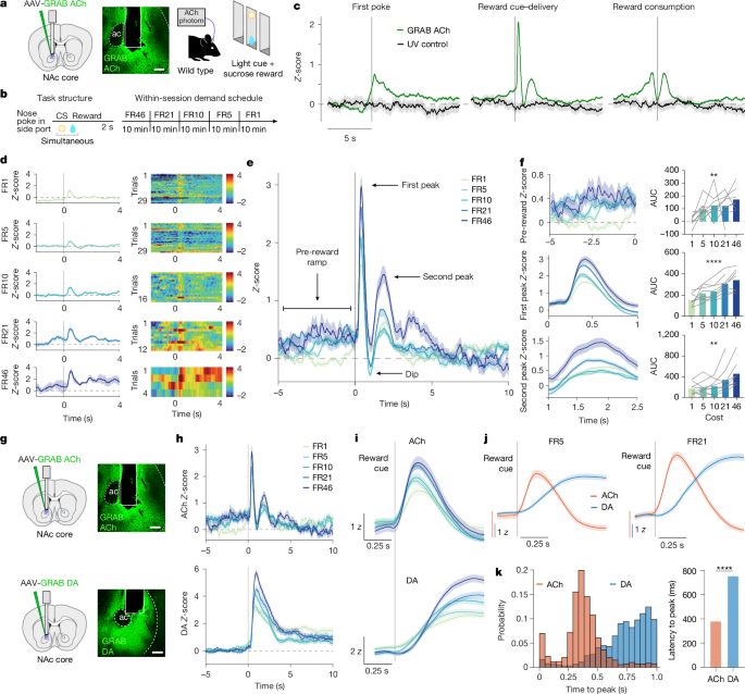 Figure 4 | Nucleus accumbens acetylcholine release exhibits a three-phase acoustic wave, with the first peak occurring approximately 400 ms earlier than dopamine, and its amplitude increasing with effort level.