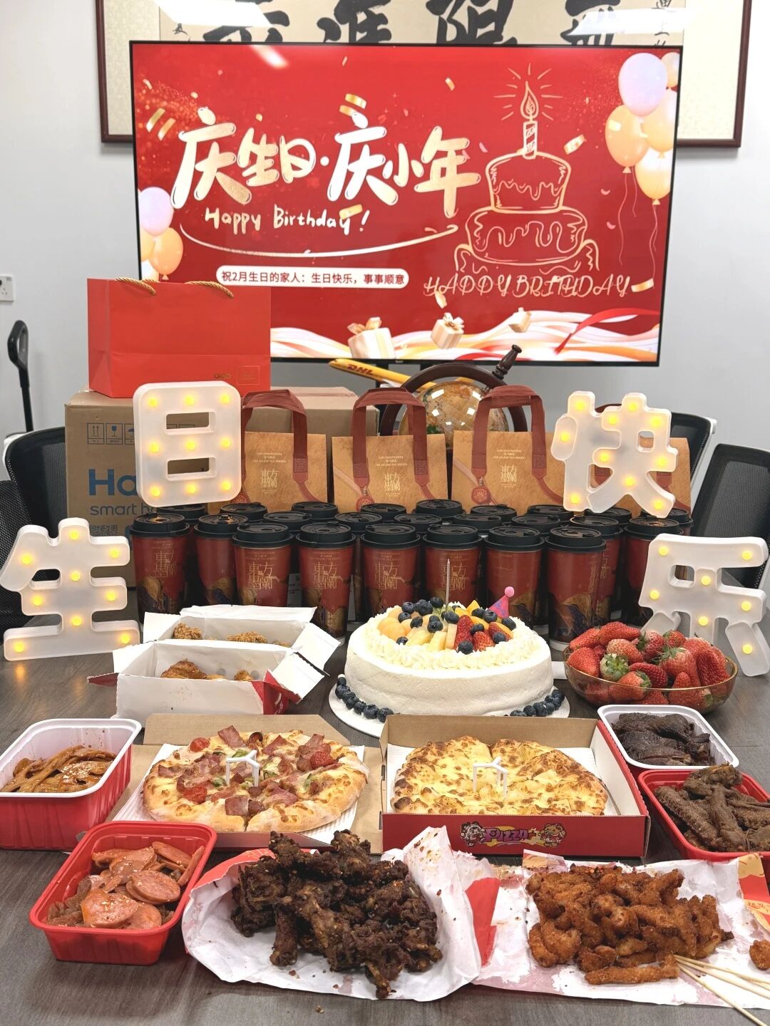 Milk tea, cakes, and various snacks were neatly arranged, satisfying all our sweet desires. Soft, sweet cakes were adorned with candles, and the birthday celebrants closed their eyes to make wishes—for a peaceful, joyful, and successful new year, and for us to walk side-by-side, with new joys every year. Cups of warm milk tea dispelled the year-end chill and eased the fatigue of the past year. A variety of snacks filled the table; everyone picked them up casually, chatting and eating, sharing the year's achievements and discussing their wishes for the Year of the Horse—relaxed and pleasant.