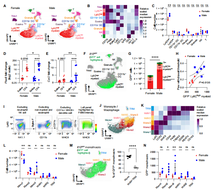 (A, B) UMAP plots of skin immune cells after CFA treatment and heatmaps of the relative expression of surface markers, with cluster colors corresponding to cell types. (C) Quantification of skin immune cells after CFA treatment. (D, E) Plac8 and Ccr2 mRNA levels in the skin of WT mice 7 days after CFA treatment. (F) Light green in the UMAP plot indicates Il10-GFP+ cells in the skin immune cell population. (G) Number of Il10-GFP+ cells in male and female mice. (H) Correlation between the number of skin Il10-GFP+Ly6Chigh myeloid cells and mechanical pain threshold 6 days after CFA treatment, R²=0.55, Pearson r=0.7444 (females: red triangles; males: blue squares). (I) Gating strategy for the selective identification of monocytes/macrophages. (J) UMAP plot showing 3 monocyte subsets, 2 MdM subsets, and 1 TRM subset. (K) Heatmap of relative surface marker expression; monocyte subsets highly express Ly6C and CCR2. (L) Distribution of each subset in the inflamed skin of male and female mice. (M) Left panel: light green in the UMAP plot indicates the distribution of Il10-GFP+ monocytes/macrophages; right panel: their proportion among monocytes/macrophages. (N) Quantification of Il10-GFP+ monocytes/macrophages.
