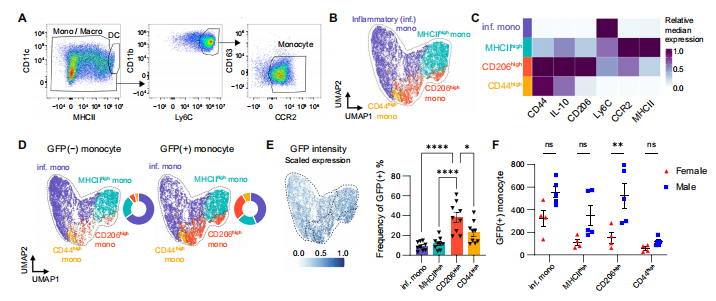 (A) Flow cytometry gating strategy for identifying monocytes from other CD45+ cells in the skin after CFA treatment; the MHCII/CD11c flow plot is consistent with Figure 2I. (B, C) Representative UMAP plots of skin monocyte subsets after CFA treatment, generated by randomly sampling 20,000 monocytes from 8 mice; monocytes were divided into four clusters—"inflammatory", MHCII+, CD206high, and CD44high—based on marker expression. (D) Distribution of each cluster in Il10-GFP+ and Il10-GFP- monocytes. (E) Frequency of Il10-GFP+ monocytes in each cluster. (F) Quantitative statistics of Il10-GFP+ monocytes in each cluster by gender.
