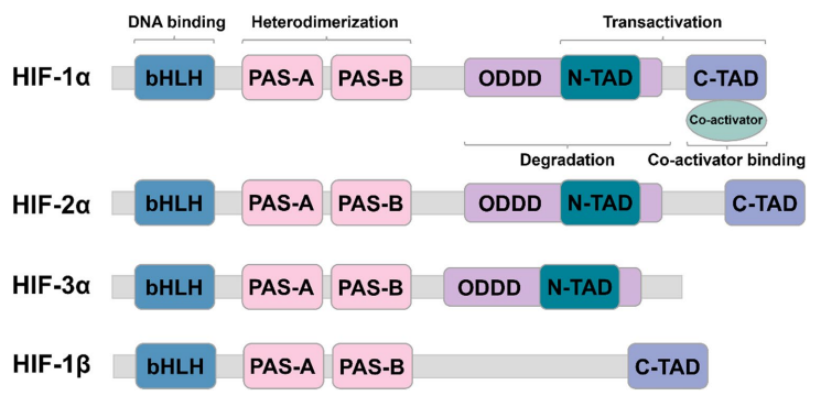 The HIF family comprises three isoforms,HIF-1, HIF-2 and HIF-3, among which HIF-1α and HIF-2α play dominant roles in tumor progression. Their shared structural domains are critical to their functions, including: