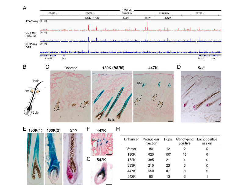 Using mouse models, the researchers performed genome-wide analyses with ATAC-seq and CUT&Tag techniques to map open chromatin regions in hair follicle epithelial cells. They discovered a unique enhancer located 130 kb upstream of the Shh gene, which they named HSRE.