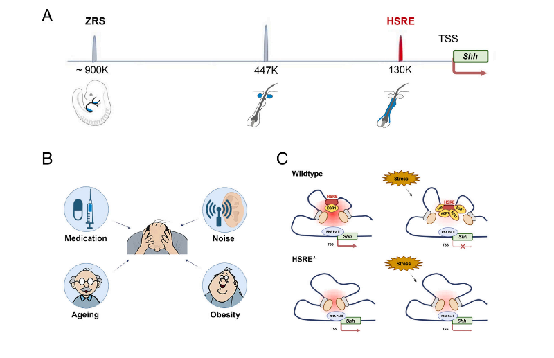 Reference: Chen et al. Convergence of external and internal stressors on a stress-responsive enhancer of the Sonic hedgehog gene to induce hair disorders. PNAS (2020). DOI: 10.1073/pnas.2529339123